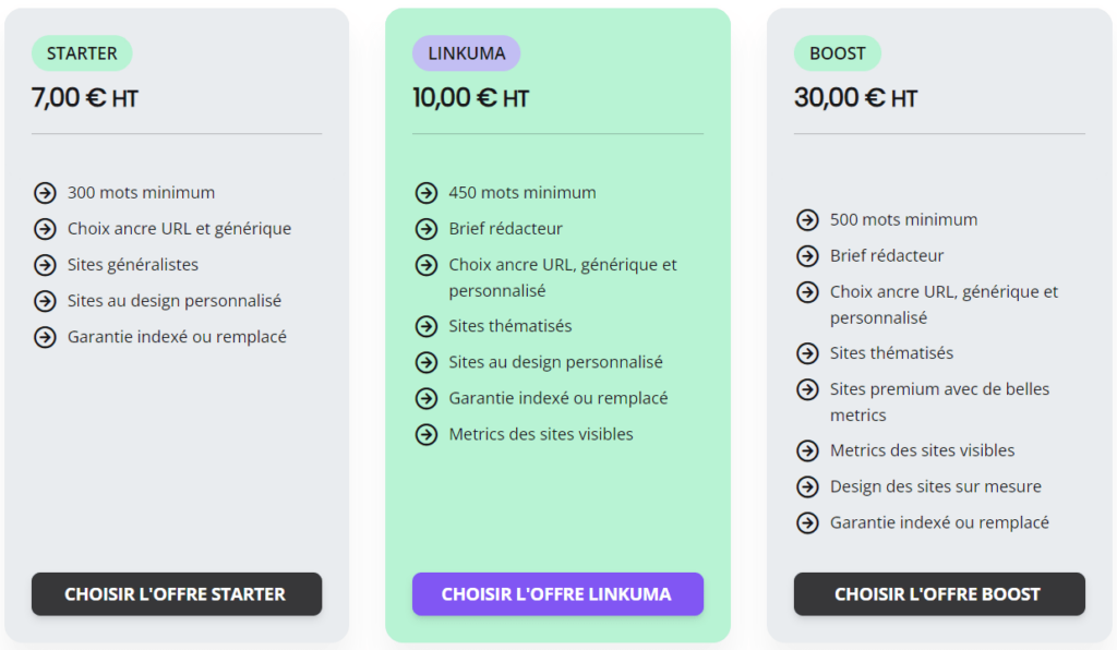 - Linkuma : Pour 10 €, cette option offre un lien sur un site thématique avec un contenu de 450 mots. Les backlinks thématiques sont plus efficaces car ils sont plus pertinents aux yeux des moteurs de recherche.
